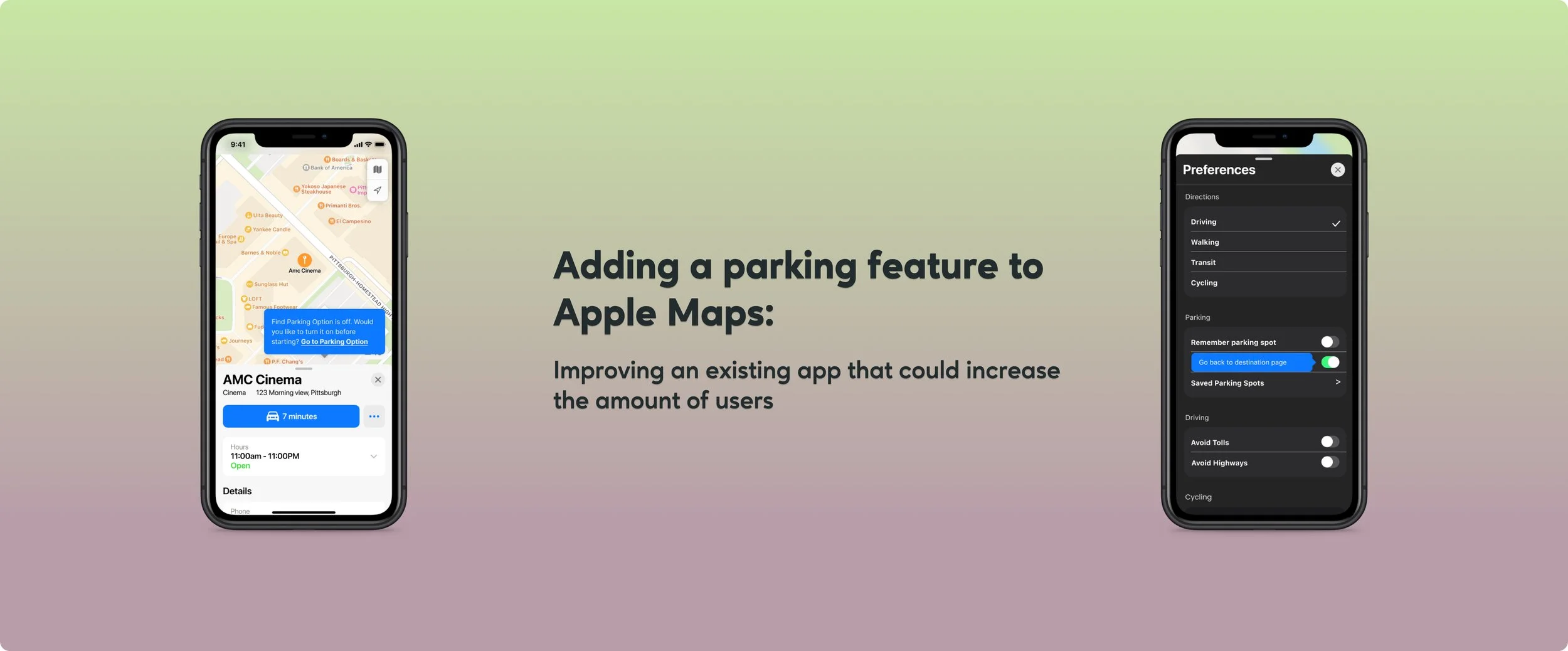 Overview: adding and refining a parking feature to Apple Maps so it can have a distinct feature that sets it apart from the more popular navigation apps