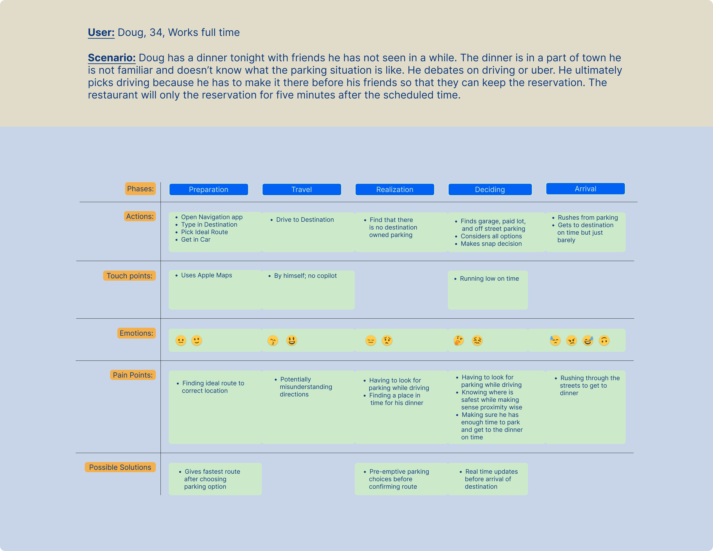 This was another new exercise I conducted. It became a creative way to synthesize research while also picturing solutions to user’s pain points. Since this project was not as intensive as the others, I felt comfortable learning exercises I wasn’t as familiar with. While at time’s I wasn’t sure if it was actually necessary, in the end it did end up being very helpful. It allowed research to be applied while coming up with solutions that could be applied when prototyping. The scenario for the user journey map was easy to think of after conducting user interviews. I took little bits of information that seemed like the most reoccurring during the interviews and used them to create the scenario breakdown.