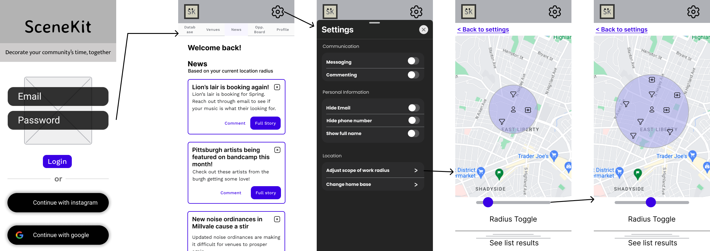 Solutions: After interviewing a range of different types of musicians, I found there were multiple problems. It felt like making an all encompassing application could be a virtual swiss army knife for local music scenes. We could keep it as local or as large as the user would like by having a distance radius tool similar to other apps like zillow or tinder.