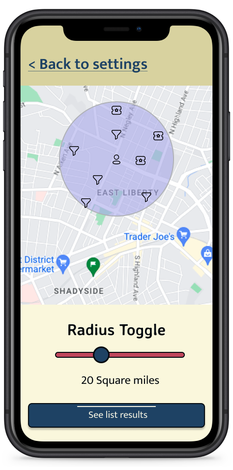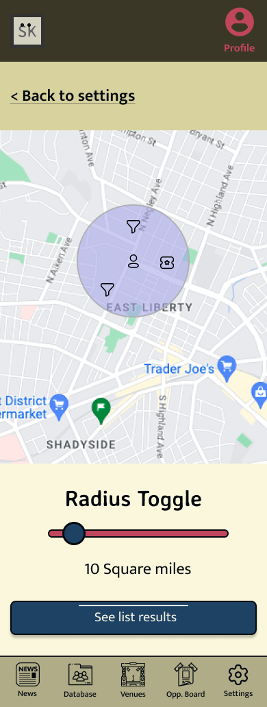 Change the distance radius so that the user can see more events, artists, etc. going on around them