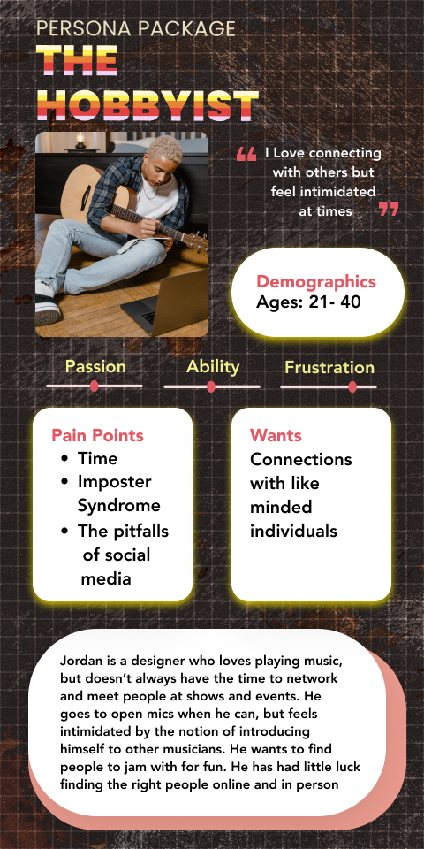 I developed two different personas from this research. One for each type of initial user. One being a more professional forward musicians and the other more hobbyist style. My interview candidates all reflected each one or were a mix of each one so it made sense to create two personas. As the applications features grow I believe types of users will grow which will then result in even more personas. I believe producers and studio musicians could eventually find use for this app. Something that I took from the user interviews is helping build up local music communities is to not intimidate users who don’t have as much professional experience. Some users aren’t able to make it out to shows regularly or just want to jam and meet new people with similar interests. The research proved that users will differ depending on age, interest, and passion.